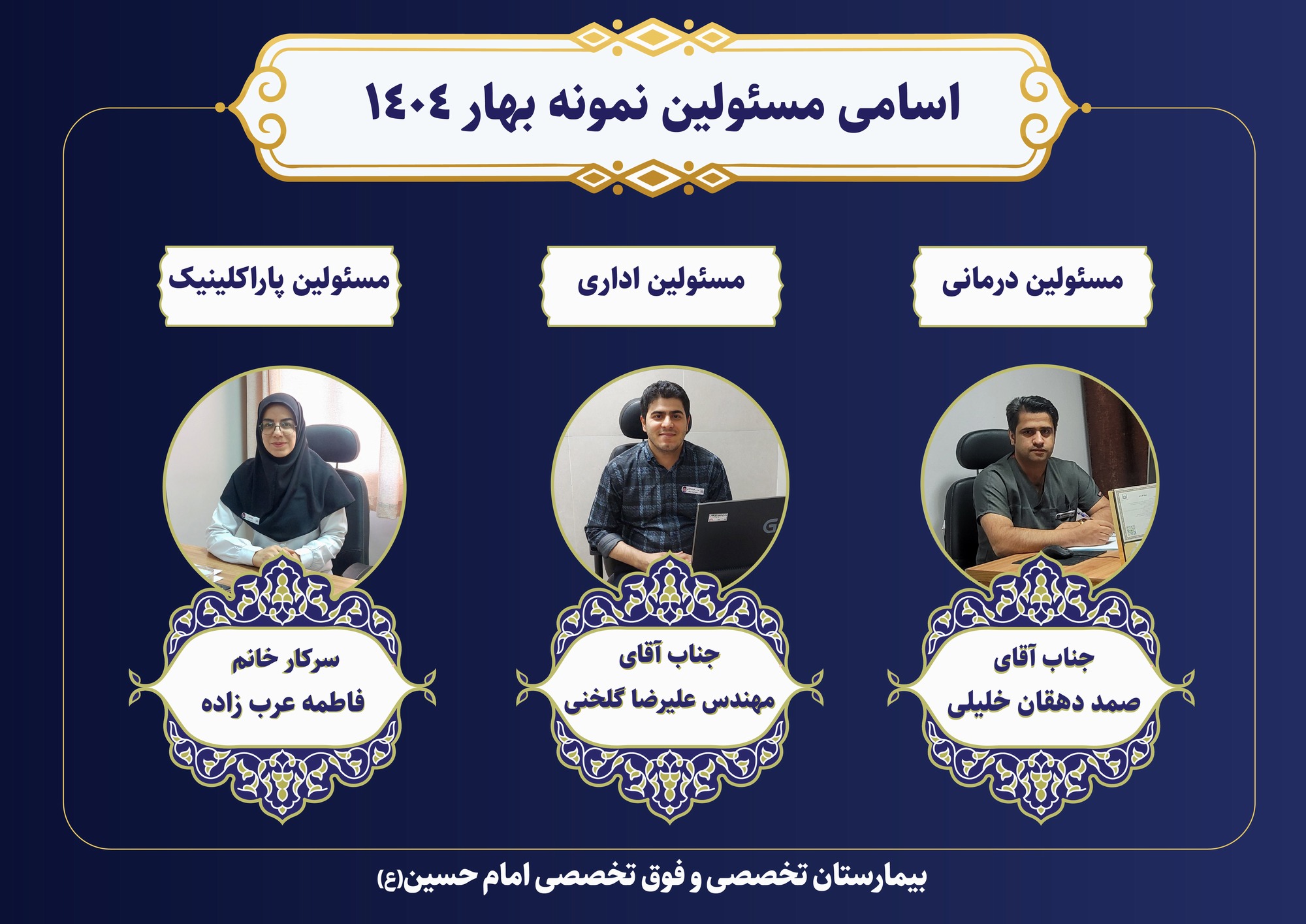 با تبریک و قدردانی ویژه، اسامی مسئولین نمونه بیمارستان امام حسین (ع) در بهار ۱۴۰۴ به شرح زیر اعلام می‌گردد: