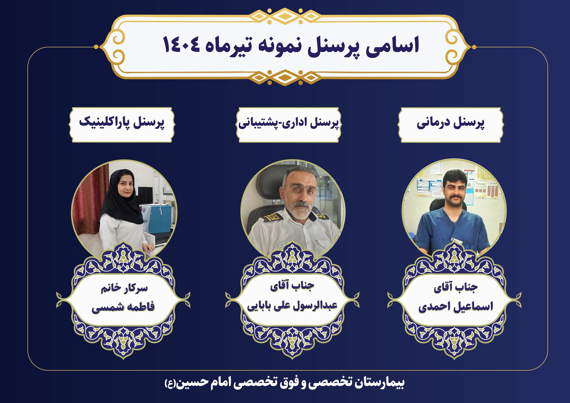اعلام اسامی پرسنل نمونه تیر ماه ۱۴۰۴ در بیمارستان تخصصی و فوق تخصصی امام حسین(ع)