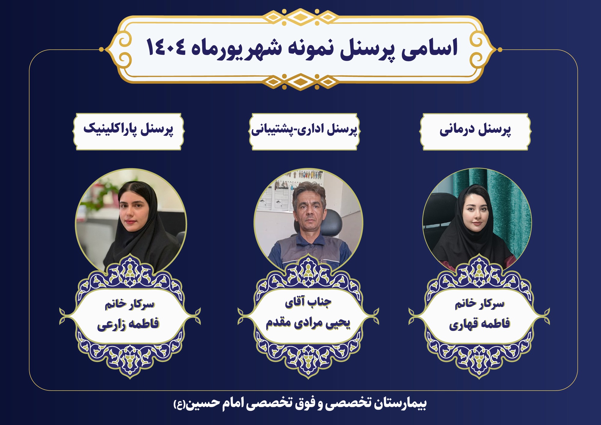 اعلام اسامی پرسنل نمونه شهریور ماه ۱۴۰۴ در بیمارستان تخصصی و فوق تخصصی امام حسین(ع)