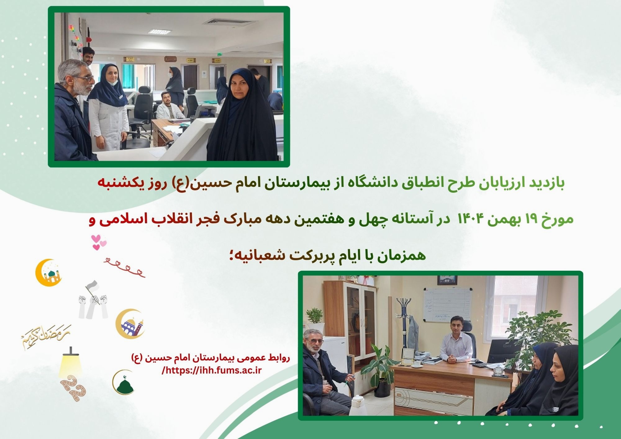 در آستانه چهل و هفتمین دهه مبارک فجر انقلاب اسلامی و همزمان با ایام پربرکت شعبانیه، ارزیابان و ناظران طرح انطباق دانشگاه علوم پزشکی، روز یکشنبه مورخ ۱۹ بهمن ۱۴۰۴ از بیمارستان امام حسین(ع) بازدید به عمل آوردند.