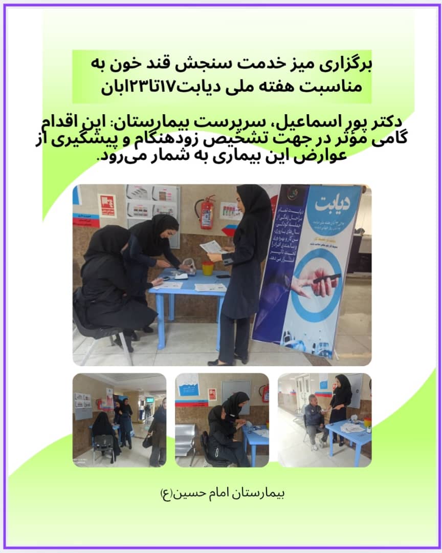 به مناسبت هفته ملی دیابت ۱۷تا۲۳ آبان، میز خدمت سنجش قند خون در بیمارستان امام حسین برپا گردید.