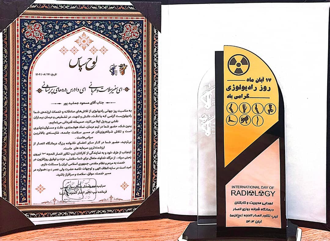 به گزارش روابط عمومی بیمارستان، مسئول بخش رادیولوژی، از حضور پرسنل تیپ انصارالحجه در بخش تصویربرداری و تقدیر از زحمات پرسنل این بخش با اهدای لوح تقدیر و تندیس خبر داد.