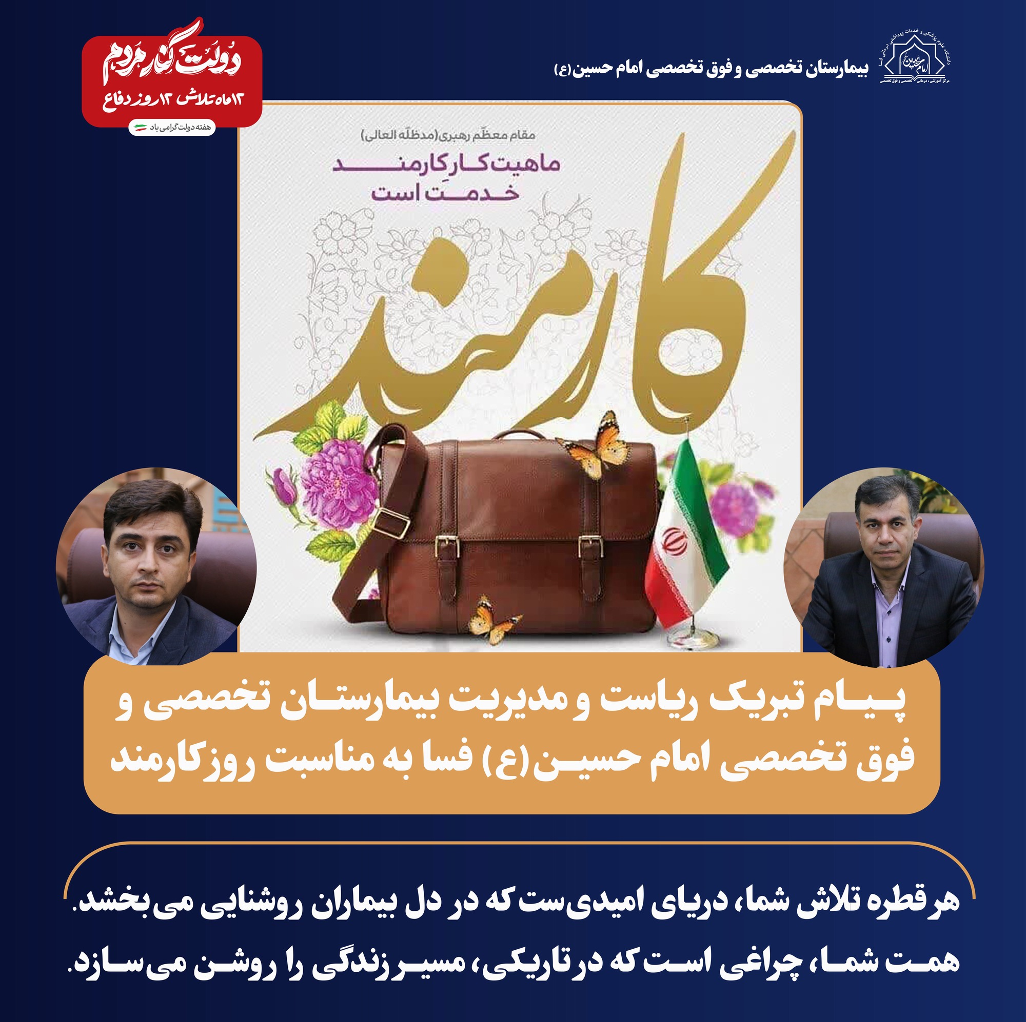پیام ریاست و مدیریت بیمارستان تخصصی و فوق تخصصی امام حسین(ع) به مناسبت روز کارمند