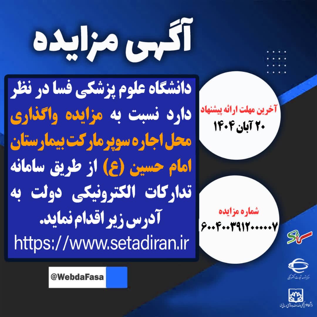 دانشگاه علوم پزشکی فسا در نظر دارد نسبت به مزایده واگذاری محل اجاره سوپرمارکت بیمارستان امام حسین (ع) از طریق سامانه تدارکات الکترونیکی دولت به آدرس: https://www.setadiran.ir اقدام نماید.